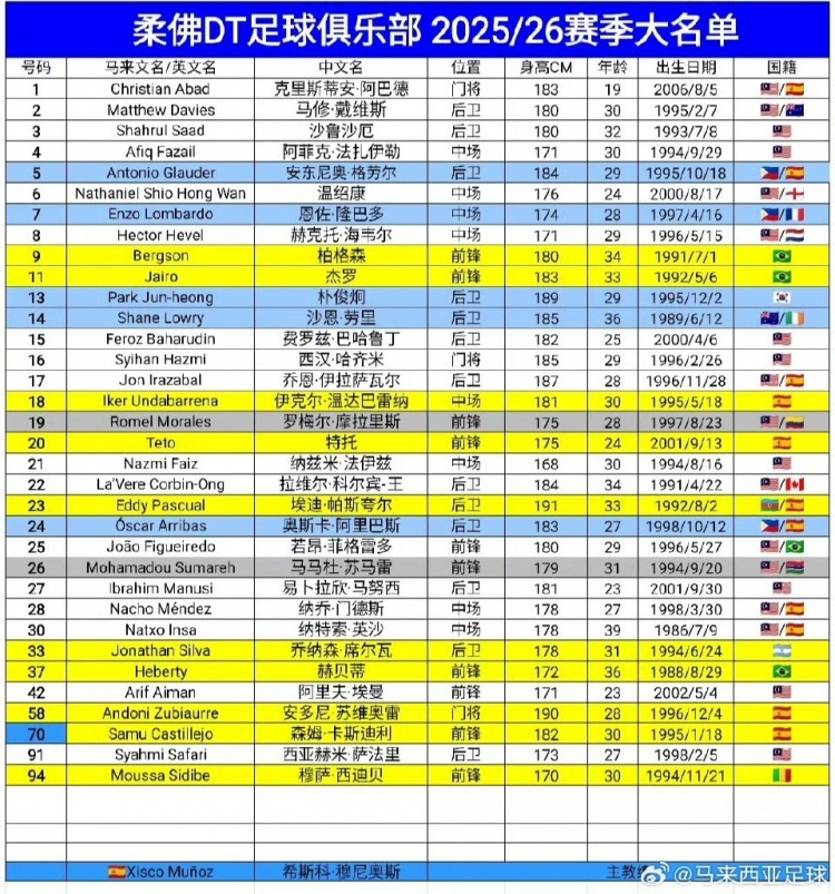 博主“马来西亚足球”在社媒撰文,对柔佛新山阵容进行介绍,该博主表示: