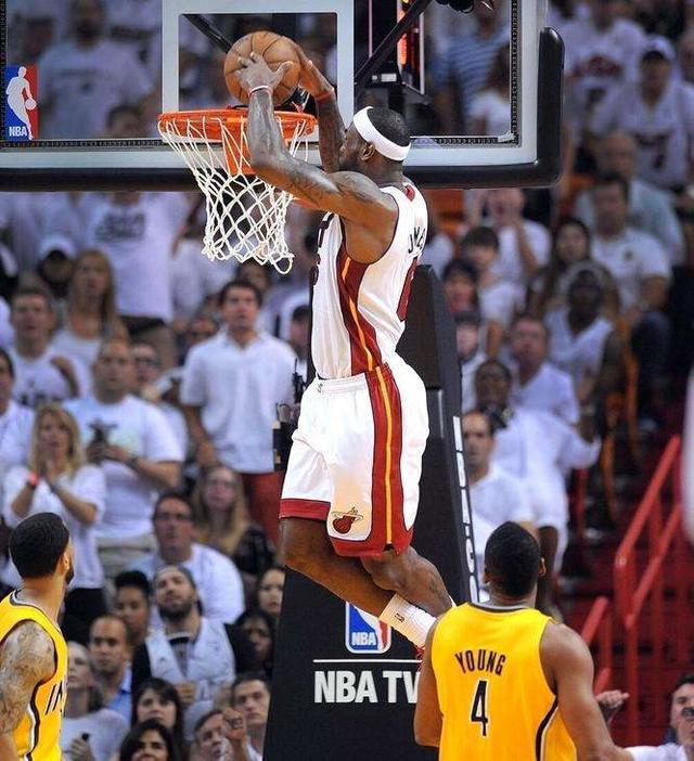别人说詹姆斯不喜欢扣篮大赛,他的扣篮水平有限,但是在实战之中,我们见到非常多他飞身战斧式的暴扣。包括当年在热火的时候,詹姆斯做出了一记,超框双手暴扣,如下图。詹姆斯扣篮的视觉效果非常棒,但是他从来不参加扣篮大赛,在实战之中的扣篮,好像也不逊色扣篮大赛的水平。